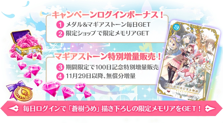 「マギレコ」,11月29日1:00より「リリース100日記念キャンペーン」を実施。メダルを集めて蒼樹うめ氏描き下ろしのメモリア獲得のチャンス