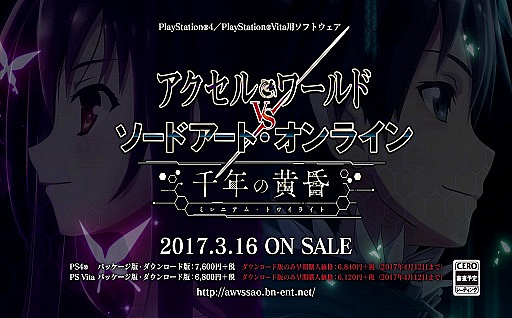 株式会社バンダイナムコエンターテインメントは 2017 年 3 月 16 日に発売を予定しておりますPlayStation 4/PlayStation Vita用ソフトウェア「アクセル・ワールド VS ソードアート・オンライン 千年の黄昏」の第 1 弾CMをゲーム公式サイトにて公開いたしましたのでお知らせいたします。