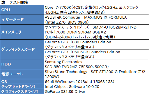 導入するグラフィックスドライバはテスト開始時点の最新版となる「GeForce 381.89 Driver」。そのほかテスト環境は表のとおりだ。