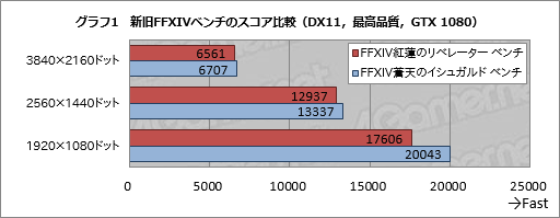 スコアを見ていこう。グラフ1はGTX 1080で実行した結果だが,FFXIV紅蓮のリベレーター ベンチで得られたスコアがFFXIV蒼天のイシュガルド ベンチと比べて下がっているのが見てとれる。描画負荷が低いほどスコア差が付き,1920