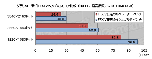 平均フレームレートをまとめたグラフ4だと,FFXIV紅蓮のリベレーター ベンチのスコアはFFXIV蒼天のイシュガルド ベンチのスコア比で81〜83%程度。こちらでもGTX 1080でテストしたときと同程度にはフレームレートが低下しているのを確認できる。