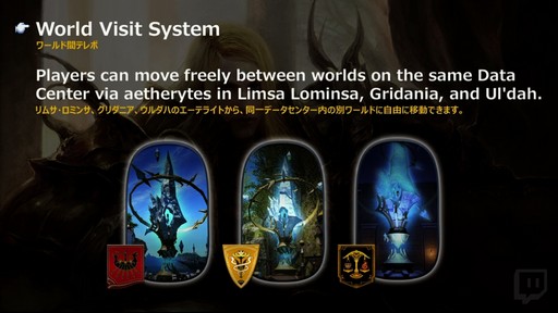 ワールド間テレポは,16日の基調講演でも説明があったが,より詳しい内容が語られたので改めて紹介しよう。これは,同じデータセンター内のワールドを,自由に行き来できるというシステムで,リムサ・ロミンサ,グリダニア,ウルダハにあるエーテライトから行える。ワールド間テレポを行う際,対象となるワールドの混み具合をシステム上で確認した後に,移動先のワールドの同じエーテライトの前に到着する。