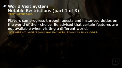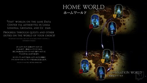 このシステムの導入と同時に,ホームワールドとビジターワールドの概念が導入される。現在,自分がいるワールドをホームワールド,ワールド間テレポで移動できるほかのワールドがビジターワールドとなる。ホームワールドからビジターワールドへ,ビジターワールドからほかのビジターワールドへと,同じデータセンター内なら自由に移動が可能だ。