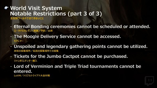 ビジターワールドでは,リテイナーの雇用と呼び出しができない。当然だが,そのためにマーケットの出品もできない。ハウジングについても,土地や家,アパルトメントを持てるのはホームワールドのみとなる。ホームワールドを切り替えたいときは,ワールド移転サービス(のちにホームワールド切り替えサービスに変更される予定)を利用してほしいとのこと。FC関連機能はチャットのみ使用可能。LSチャットは使用できないが,こちらについてはどうにかしたいと話していた