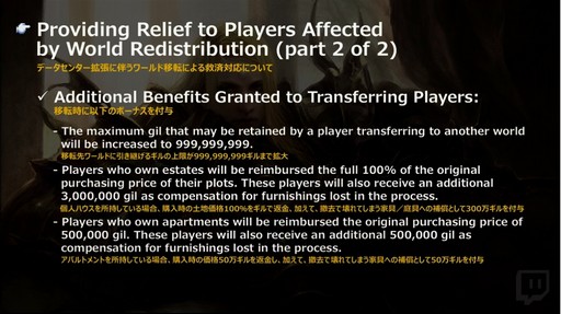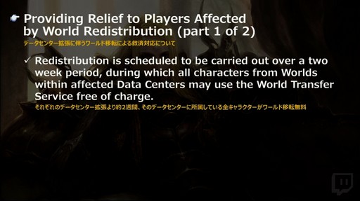 データセンター拡張に伴うワールド移転の救済措置として,データセンター拡張より2週間は,データセンターに所属している全キャラクターのワールド移転が無料で行える。一度ワールド移転を行うと3日間ホールドされるという制限はあるものの,移転回数の制限はない。また,移転時に引き継げる金額の拡大や,ハウジングとアパルトメント購入代金の返還,家具/庭具などの補償なども行われる。