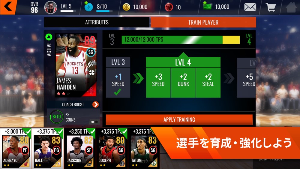 「NBA LIVE Mobile バスケットボール」,選手の育成システムが実装
