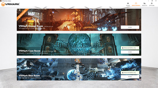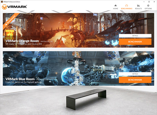 VRMarkは,今日(今日)のVRアプリケーションにおける標準的な負荷で性能を調べる「Orange Room」と,将来に登場するであろう,より負荷の大きいVRアプリケーションに対する適性を調べる「Blue Room」,以上2つのテストで構成されている。