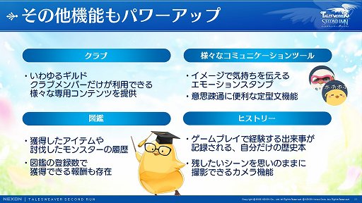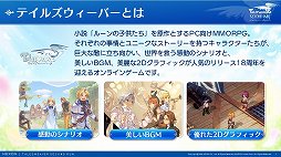 本作の概要は,運用ディレクターを務める細田 光氏より紹介された。それによると本作には,「テイルズウィーバー」にはなかった新規追加コンテンツと,長所を継承しつつクオリティを高めたパワーアップコンテンツがあるという。