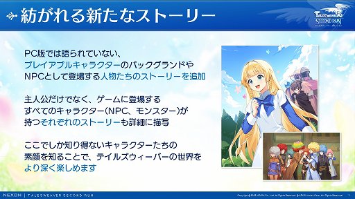 また本作には,「テイルズウィーバー」にて語られていなかったプレイアブルキャラクターの背景や,NPCのストーリーが追加されている。モンスターを含むすべてのキャラクターが持つストーリーを描写していくとのことで,「テイルズウィーバー」の世界をより深く楽しめるとのことだ。