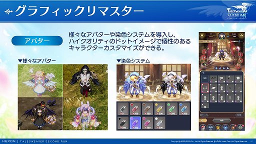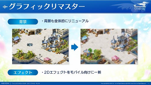 パワーアップコンテンツとしては,まずリマスタリングされたグラフィックスが紹介された。キャラクターは「テイルズウィーバー」の初期開発メンバーとともに,コンセプトを維持しつつ,18年前に描かれたものをリマスタリングしていったという。また背景や演出,アバターも手が加えられ,最適化されている。