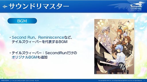 グラフィックスは,ドット絵ではなくなっているが「テイルズウィーバー」の雰囲気そのままという感じで,まったく違和感がない。BGMもおなじみの曲が流れ,とくにタイトル画面の「Second Run」は,初期の「テイルズウィーバー」を遊んだことがある人なら懐かしくなるだろう。
