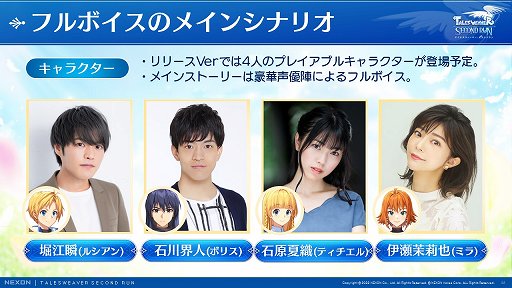 しかし開発の過程で端末のスペックが向上したり,スマホゲーム市場の変化があったりとしたことから,「テイルズウィーバー」の魅力であるストーリーや音楽を継承しつつ,新しいタイトルとしてさまざまな要素を採り入れたそうだ。とくに戦略性や,ほかのプレイヤーとの共闘を加えた新しい戦闘システムが大きな特徴になっているという。加えて,本作が日本のRPGファンに向けて開発されたタイトルであり,他国に先駆けて日本で最初にサービスを展開することも明かされた。