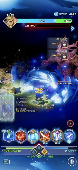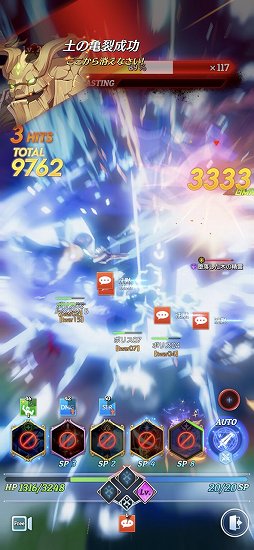 基本的な戦い方は,バフスキルをかけて操作しているキャラクターを強化し,最後にフィニッシュスキルを使って大ダメージを与えるというもの。スキル発動の演出が派手で,かつ画面に表示される情報量が多いため,初見プレイでは何が起きているのか理解できず戸惑うが,やっているうちに何となく「あー,この順番でスキルを使っていけばいいのか」と分かってくるという感じだ。各スキルの能力をきちんと把握し,最大火力をを狙う,あるいは複数の局面に対応できるようにするといった構成を考えるのは,確かに面白そうだし,奥が深そうだ。