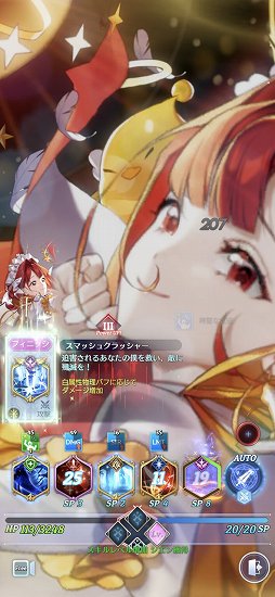 スキルには大ダメージで敵を攻撃する「フィニッシュスキル」のほかに,属性バフを増加させる「サポート」,スキルのダメージを増加させる「攻撃強化」,キャラクターの能力値を増加させる「能力強化」,最大ダメージの上限を増加させる「リミットブレイク」といったバフタイプがある。それぞれ消費SPが異なり,またクールタイムが設定されている。