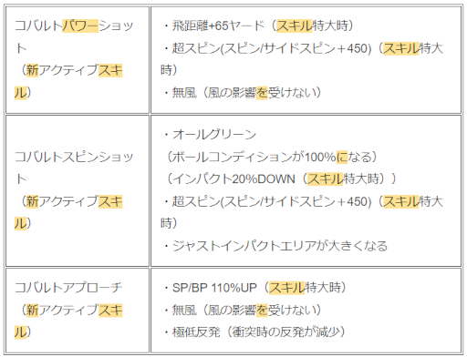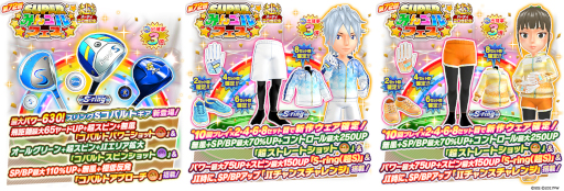 今回のギアガチャには、S-ringシリーズより最大パワー630を誇る、スリングSコバルトギアが新登場!ウェアガチャには「SP/BP最大70% Up」+「無風」+「コントロール+250」効果のアクティブスキル「超ストレートショット」など複数スキルを搭載した新作ウェアが登場。さらに「10回プレイ」2・4・6・8セット目で新作ウェアが確定となります。ぜひ、ご参加ください!