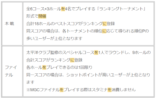 さらに、MGCファイナル進出者枠も拡大し、MGC本戦の上位2,000名(通常時100名)が進出することができます。上位2,000名で競うMGCファイナルは、数々の名門コースを手がける株式会社太平洋クラブ監修のスペシャルコースが舞台となります。