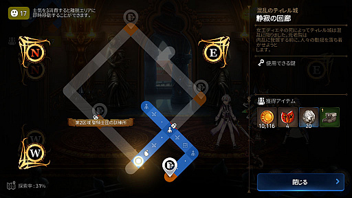 バトル系コンテンツには,さまざまな迷宮に潜る「戦闘」も存在する。こちらは名称に反して“フィールド内の奥側・手前側への移動も駆使して動き回る探索もの”になっており,序盤に開放される城内の探索などは,それこそシティアドベンチャーのような楽しさがあった。