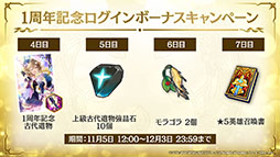 「1周年イベント」の内容だ。同イベントでは,ルーンドロップ量が100%アップしたり,経験値獲得量が30%アップしたりする「英雄育成キャンペーン」,1周年記念古代遺物や★5英雄召喚書などを獲得できる「1周年記念ログインボーナスキャンペーン」,最大70回が無料になる召喚キャンペーンなどがラインナップされている。