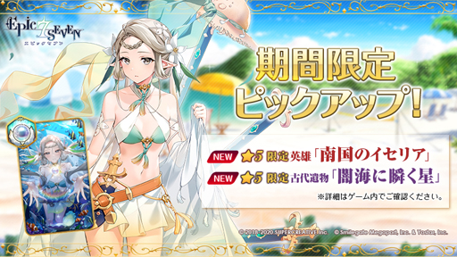 限定英雄「南国のイセリア」と限定古代遺物「闇海に瞬く星」が期間限定召喚でピックアップ中です。詳細はゲーム内をご確認ください。