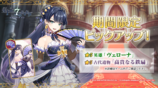 ★5英雄「ヴェローナ」と★5古代遺物「高貴なる鉄扇」が期間限定召喚でピックアップ中です。詳細はゲーム内をご確認ください。