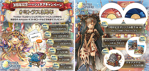 期間中、Twitterにて、『ミトラスフィア』公式Twitterアカウント(@mitrasphere_pr)をフォローし、対象のハッシュタグ「#ミトラス3周年」をツイートしてくださった方の中から抽選で、Amazonギフト券コードや、オリジナルグッズ、ゲーム内アイテム「海晶石」などをプレゼントいたします。