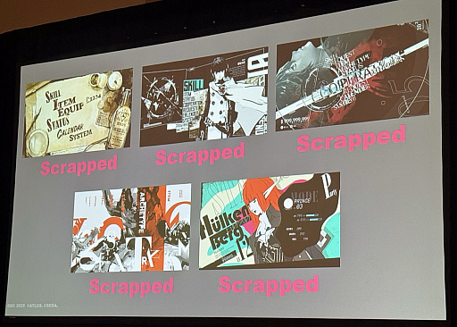 制作の流れとしては,ゲーム全体のUIに影響するメインメニューのデザインを考えて,それをほかの部分に反映していった。講演では,実際に制作された初期UIコンセプトが5つ紹介されたが,いずれもユニークで魅力的でありながら,最終的にすべてボツになったという。