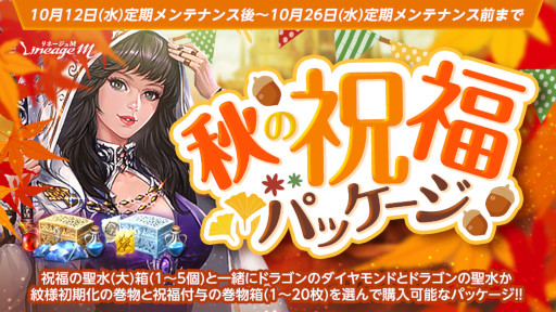 【概要】 「ドラゴンのダイヤモンド」200個や、「ドラゴンの聖水(イベント)」5個など「アインハザードの祝福」増加アイテムが獲得できる「秋の祝福パッケージ(ドラゴンのダイヤモンド)」と、「紋様初期化の巻物(イベント)」2個や「祝福付与の巻物箱(1〜20枚)」2個などのアイテムが獲得できる「秋の祝福パッケージ(巻物) 」の2種類から選んで購入できる「秋の祝福パッケージ」が登場しました。 キャラクターの紋様強化を行う際、非常に効果の高い「祝福の聖水(大)箱(1〜5個)」が両パッケージに付属しています。 「秋の祝福パッケージ」は、1アカウントにつき4回まで購入できます。