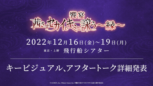 株式会社ブシロード(本社:東京都中野区、代表取締役社長:木谷高明)のグループ会社である株式会社劇団飛行船(本社:東京都中野区、代表取締役社長:小原正司)が、2022年12月に『饗宴「茜さすセカイでキミと詠う〜縁〜」』のキービジュアル、アフタートークの詳細を発表したことをお知らせします。