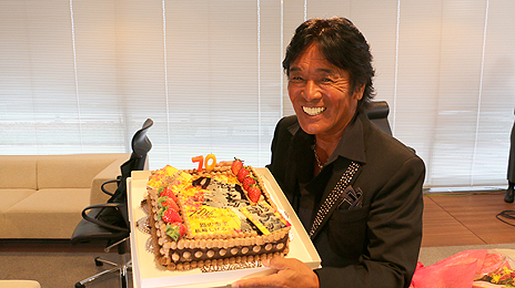 CM撮影の数日前に70歳を迎えた松崎さん。いつまでも若々しい松崎さんを、「デュエル・マスターズ」デザインのチョコレートケーキで祝福 |