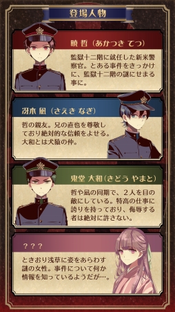 本日の「(ほぼ)日刊スマホゲーム通信」では,スマホ向けアドベンチャーゲーム「謎解きノベル×脱出ゲーム 監獄少年」を紹介しよう。舞台は大正時代の東京。特殊高等警察に所属する新人“暁 哲”がさまざまな事件に挑む,プレイヤーの頭能力が試される作品だ。
