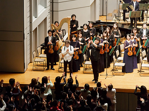 「やるぞ!」という掛け声とともにピアノに向かった伊藤氏が演奏したのは,「FF外伝」のオープニングとエンディングで流れた「Rising Sun」。今回は「聖剣伝説」シリーズ初のオーケストラコンサートとなったこともあり,すべての楽曲が聴きどころとなる内容だったのだが,「FF外伝」と同じ演出となったこの最後の演奏によって,会場全体の「聖剣伝説」への思いはまさに一つになったのではないだろうか。