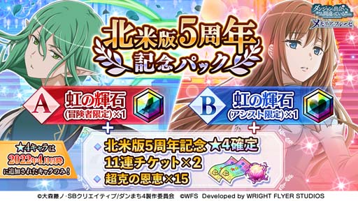 「ダンまち〜メモリア・フレーゼ〜」の北米版リリース5周年を記念して、2種類のお得なアイテムパックが登場!このパックに含まれる北米版5周年記念★4確定11連チケットで引けるガチャの★4キャラは、2022年4月以降に追加のキャラのみが出現します!