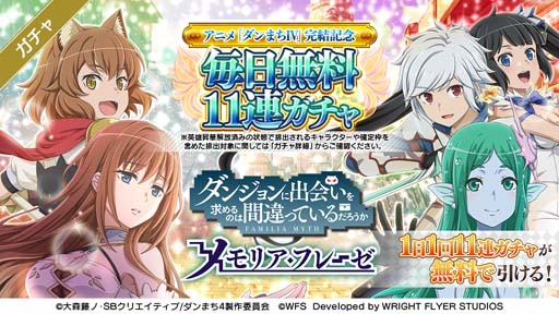 TVアニメ「ダンまちⅣ」の完結を記念して、毎日無料11連ガチャキャンペーンを開催中!開催期間中、毎日1回限り、無料で11連ガチャを回すことができます。