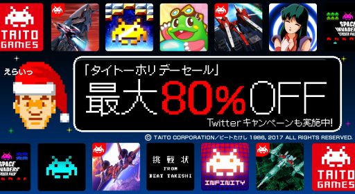 株式会社タイトー(本社:東京都新宿区、以下タイトー)は、2017年12月15日(金)から2018年1月15日(月)まで、対象となるスマートフォン向けアプリゲームが最大80%オフとなる「タイトーホリデーセール」を実施いたします。