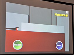 「Canabalt」との最大の違いは,足場の色だ。キャラクターが走っていく足場には2色あり,プレイヤーはキャラクターの色を入れ替えることで,足場とキャラクターの色を同じにしていかなければならない。違う色の足場に着地すると即,ゲームオーバーだ。言葉にするとちょっと分かりにくいかもしれないが,実際に写真を見てもらえば「なるほど」と納得できるはず。結果として,実に洗練された作品になったわけだ。