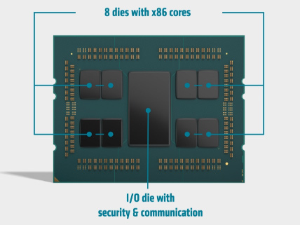 EPYC 7002シリーズは,CPUパッケージの中央にメモリコントローラやI/O機能をまとめたI/Oダイを1基配置し,その周囲に1基あたり8基のCPUコアを統合したCPUダイが最大で8基並ぶという構造を採用している。CPUダイが1基で8コアなので,最大64コアを実現できる計算だ。