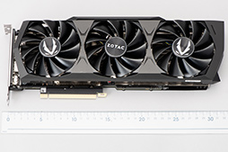 GPUクーラーは2.5スロット占有タイプで,90mm角相当のファンを3基搭載する独自クーラー「IceStorm 2.0」だ。ZOTACによると,新しい11枚羽のファンは,従来のものに比べて空気流量が10%向上しているという。また,GPUへの負荷が低いとき,いわゆるアイドル時にファンの回転を停止させる機能も備えている。