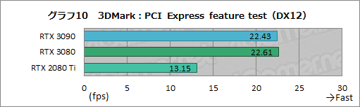 グラフ10は,PCI Express feature testの結果だが,RTX 3090はPCIe 4.0に対応したことで,RTX 3080と同じくRTX 2080 Tiに大差を付けている。インタフェース規格における転送レートの差が,しっかりと結果に表れている。