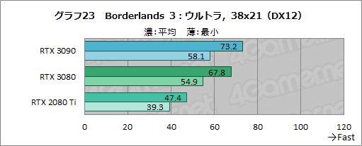 RTX 3090とRTX 3080の平均フレームレートにおける差は4〜8%程度と,Borderlands 3の3840×2160ドットまでと似た傾向だ。7680×2160ドットでは,RTX 3090でも最小フレームレートが11fps程度にまで落ち込んでいるので,プレイするには少々厳しい結果に終わっている。RTX 3080に対しても,7680×2160ドットで明確な差を付けることができいない。
