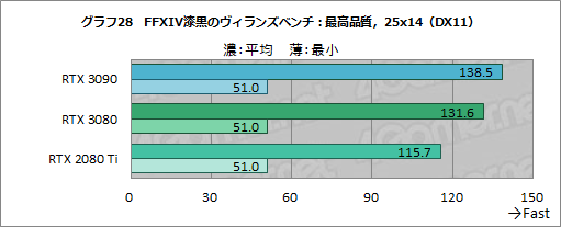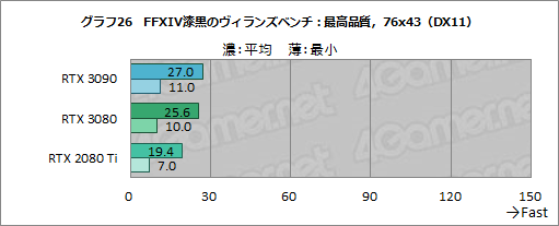 そんなFFXIV漆黒のヴィランズ ベンチにおける平均フレームレートと最小フレームレートをまとめたものが,グラフ26〜28だ。