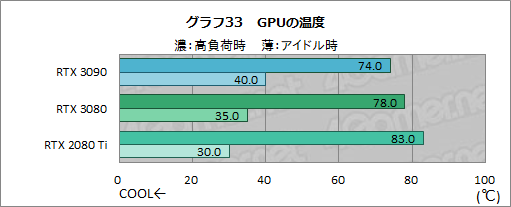 最後に,GPU-Zを用いて計測したGPU温度も確認しておきたい。ここでは,温度約24℃の室内で,テストシステムをPCケースに組み込まず,いわゆるバラックに置いた状態から,3DMarkの30分間連続実行時を「高負荷時」として,アイドル時ともども,GPU-Zから温度を取得することにした(グラフ34)。