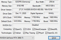グラフィックスドライバには「GeForce 460.89 Driver」を利用。これは,テスト時に最新バージョンとなるものだ。また,RTX 3060 TiはPCI Express 4.0(以下,PCIe 4.0)に対応しているため,CPUに「Ryzen 9 5950X」を,マザーボードにAMD X570チップセット搭載のMSI製「MEG X570 ACE」をそれぞれ使用している。それ以外のテスト環境は表のとおり。