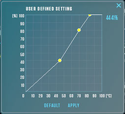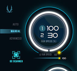 GPUクーラーは,2スロット占有タイプの「IceStorm 2.0」と呼ばれる独自クーラーで,90mm径相当のファンを2基搭載する。ZOTACの説明によると,IceStorm 2.0は,ファンの羽根を11枚にしたことで,同社従来製品と比べて空気流量が約10%向上しているという。またファンの回転数は,先述したFireStormで変更可能で,「MANUAL」を選択すると1%きざみで30〜100%に固定できる。なお,FireStormのファン設定を「ADVANCED」にすると,温度と回転数の関係を示したグラフから,各温度における回転数を任意に設定可能だ。2基のファンを個別に設定できる点は,かなりありがたい機能と言えよう。