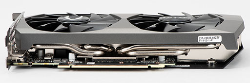GPUクーラーを横から覗き込むと,6mm径のヒートパイプを4本用いているのが分かる。ZOTACによると,これらのヒートパイプはGPUに直に接しているという。また,電源部やメモリチップもヒートシンクと接しているのが確認できる。