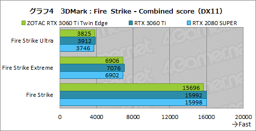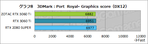 同ベンチマークでは,CPU性能の影響も大きいため,3製品にそこまで大きな差は開いていない。とはいえ,RTX 3060 Ti FEに届かず,RTX 2080 SUPERに対しては優位に立つといったZOTAC RTX 3060 Ti Twin Edgeの位置付けは,ここでも同じだ。スクウェア・エニックスの指標では,スコア7000以上が最高評価とされているが,それを踏まえると,ZOTAC RTX 3060 Ti Twin Edgeは,3840×2160ドットでも1万弱のスコアを発揮しており,快適にプレイできそうだ。