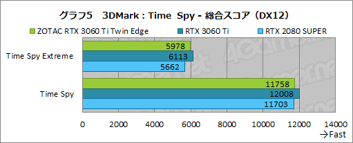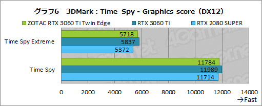 ここでも,ZOTAC RTX 3060 Ti Twin EdgeがRTX 3060 Ti FEに若干届いていないのは変わらない。なお,Time Spy“無印”では,CPUのボトルネックが近いためスコアが丸まりつつあるが,Time Spy Extremeでは,RTX 2080 SUPERとの差が約6%あり,ZOTAC RTX 3060 Ti Twin Edgeが世代の差を見せ付けている。