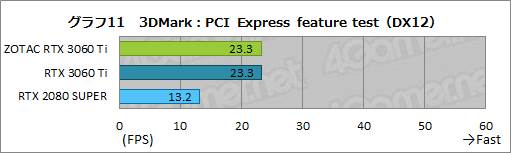 グラフ11は,PCI Express feature testの結果だが,PCIe 4.0に対応しているZOTAC RTX 3060 Ti Twin EdgeとRTX 3060 Ti FEでスコアが並び,対応していないRTX 2080 SUPERのみスコアが落ち込むという,仕様どおりの結果が得られている。