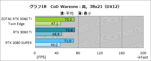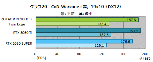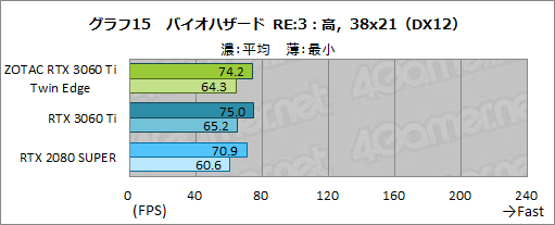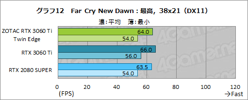 ここでは,ZOTAC RTX 3060 Ti Twin Edgeは,平均フレームレートと最小フレームレートともに若干RTX 2080 SUPERを上回っているものの,ほぼ横並びと言っていいレベルだ。RTX 3060 Ti FEには4%ほどの差を付けられているが,最小フレームレートは最大でも1fps程度の差しかなく,実際にプレイしてみると両者で差を実感することはあまりないだろう。