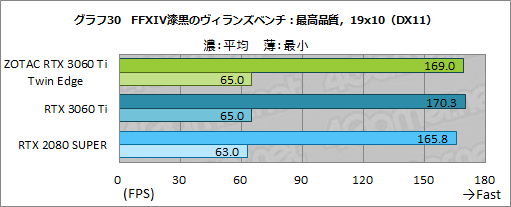 平均フレームレートは総合スコアを踏襲する形となっているが,最小フレームレートを見ると,ZOTAC RTX 3060 Ti Twin Edgeは,1920×1080ドットでRTX 3060 Ti FEとも遜色ない常時60fps以上の結果を残している点は立派だ。