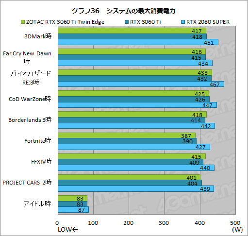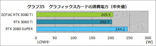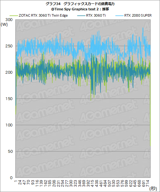 ここでも,ZOTAC RTX 3060 Ti Twin EdgeとRTX 3060 Ti FEとでは,ほぼ横並びになっており,両製品の消費電力にあまり差がないことが見て取れよう。一方で,RTX 2080 SUPERとは18〜40Wの差があり,消費電力を抑えられていることがここでも確認できる。